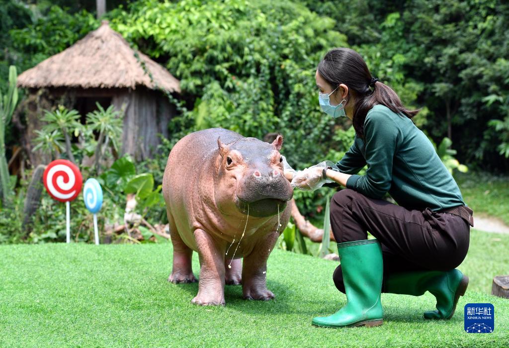 當日,非洲河馬菲菲在廣州長(cháng)隆野生動(dòng)物世界迎來(lái)兩周歲生日。菲菲是長(cháng)隆人工育幼長(cháng)大的雌性河馬寶寶,目前體重超過(guò)200公斤。