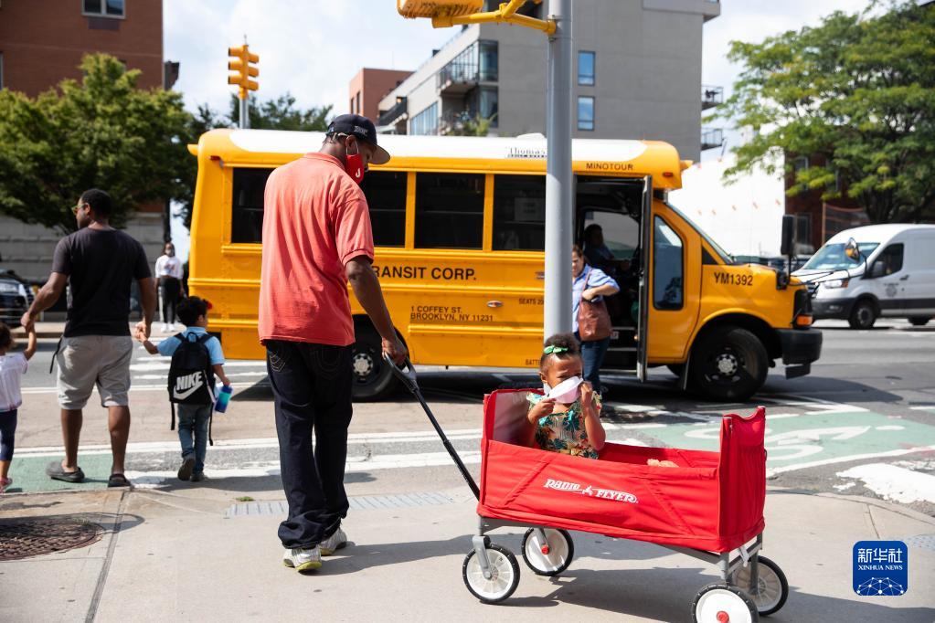 9月13日,家長(cháng)在美國紐約一所公立學(xué)校外接學(xué)生放學(xué)。當日,紐約市公立中小學(xué)新學(xué)年開(kāi)學(xué),并全面恢復在校教學(xué)。