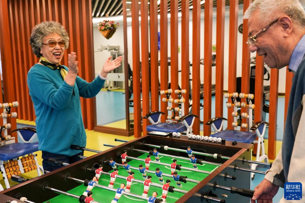 10月12日,在位于河北燕郊的燕達金色年華健康養護中心活動(dòng)中心內,呂偉業(yè)和老伴兒李戰平(左)在玩桌面足球。