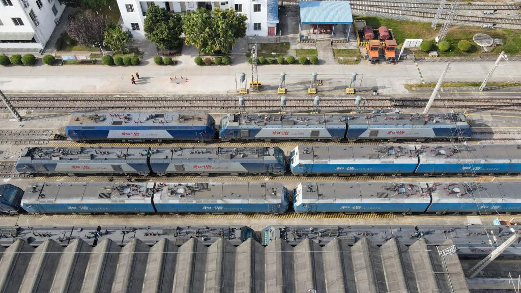這是11月23日拍攝的??吭诔啥紮C務(wù)段的中歐班列編組和諧型機車(chē)頭(無(wú)人機照片)。新華社記者胥冰潔攝