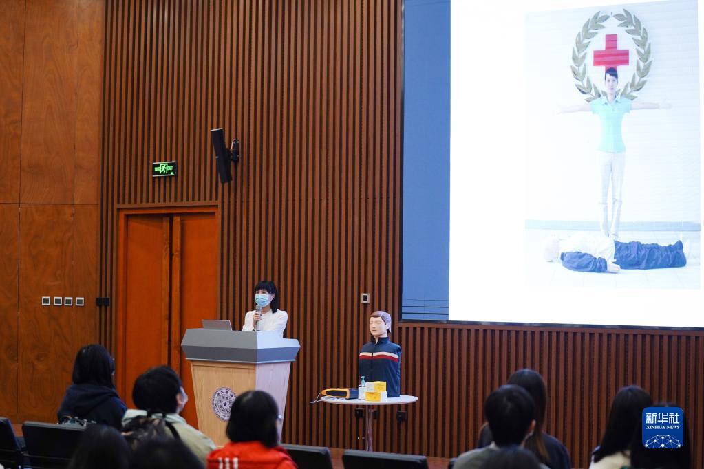 11月28日,清華大學(xué)醫院醫生李晶鈴為學(xué)生志愿者講授急救知識。