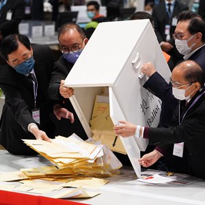 12月19日,香港特區選舉管理委員會(huì )主席馮驊(右二)打開(kāi)票箱。新華社記者 呂小煒 攝