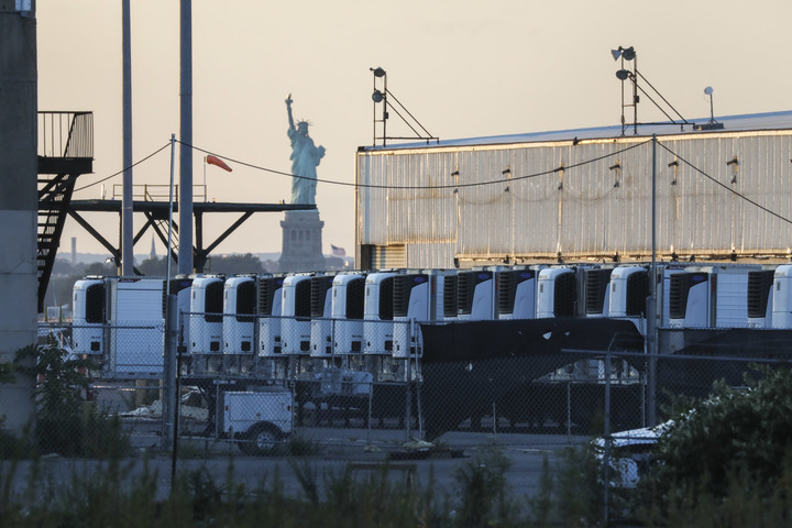 這是在美國紐約布魯克林拍攝的一處臨時(shí)停尸場(chǎng)內存放新冠患者遺體的冷藏車(chē)(2021年9月6日攝)。新華社記者 王迎 攝