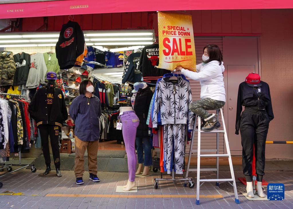12月28日,一名日本東京阿美橫町商店的工作人員將促銷(xiāo)廣告牌放在店門(mén)口。