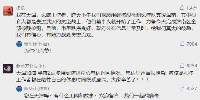 我在天津,醫院工作者,昨天下午我們緊急組建核酸檢測醫療隊支援津南,其中很多人都是去過(guò)武漢的抗疫戰士,他們前半夜就開(kāi)始了工作,力爭今天完成津南區全部核酸檢測。目前,市里秩序良好,政府公布信息非常及時(shí),給我們莫大的鼓勵,我們有信心,有能力戰勝奧密克戎。