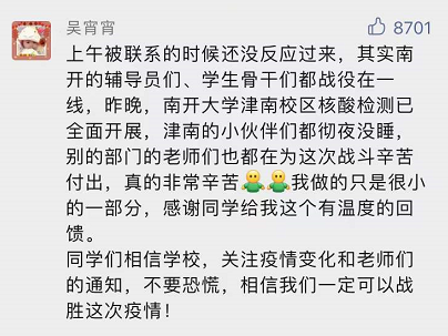 天津理工大學(xué)還在學(xué)校做實(shí)驗的研究生們,6點(diǎn)接到通知:所有現在在校的,全體都在宿舍,等待統一核酸檢測的集合通知,提前按要求自備信息條。目前已經(jīng)有序組織同學(xué)進(jìn)行核酸檢測,感慨國家的日益強大,感動(dòng)天津防疫的迅速行動(dòng),感謝學(xué)校學(xué)院領(lǐng)導們的細心周密的安排!