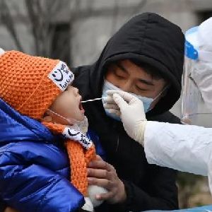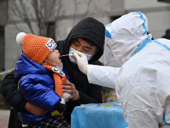 1月9日,在天津市西青區中北鎮錦曦花苑社區一處核酸檢測點(diǎn),家長(cháng)抱著(zhù)孩子進(jìn)行核酸檢測。新華社記者李然攝