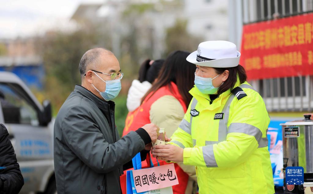 1月17日,在209國道廣西柳州市融安縣段“春運愛(ài)心驛站”,交通輔警為司乘人員送姜糖茶。新華社發(fā)(譚克興攝)