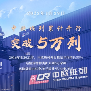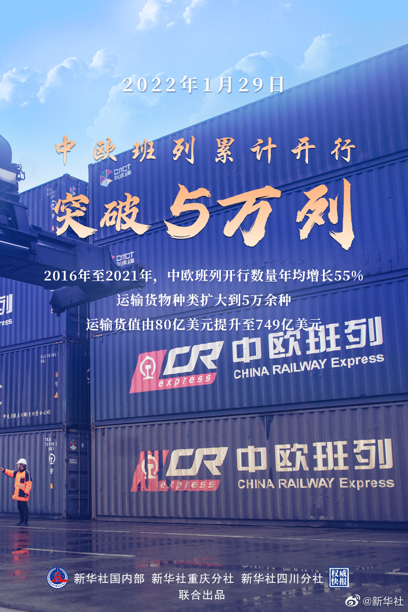 新華社北京1月29日電 記者從中國國家鐵路集團有限公司獲悉,1月29日晨,隨著(zhù)中歐班列X8086/5次從成都城廂站開(kāi)出,中歐班列累計開(kāi)行突破5萬(wàn)列,“跑”出開(kāi)行“新里程”。