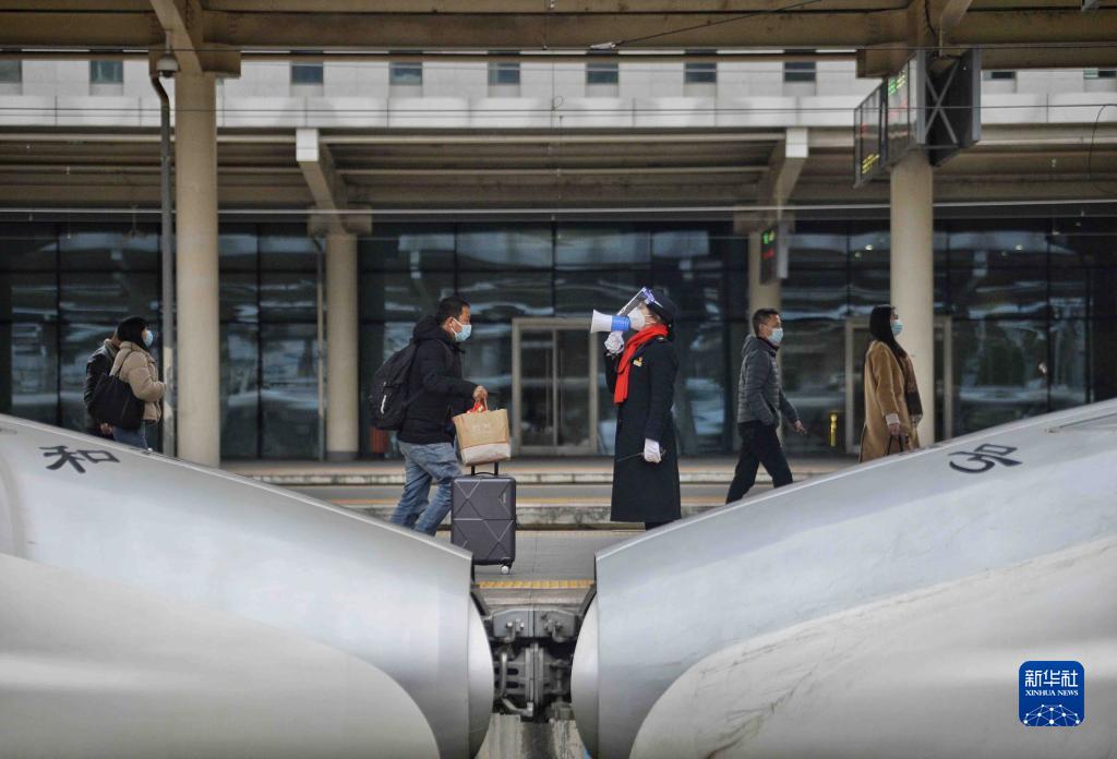 1月28日,寇莉(中)在接送過(guò)站列車(chē)。