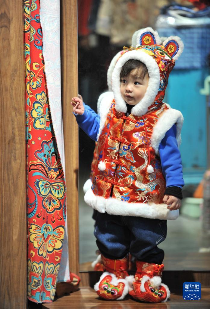 1月24日,在河北省鹿泉市土門(mén)關(guān)驛道小鎮巧手工坊內,一名小朋友身穿虎頭襖和虎頭鞋。