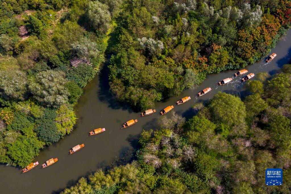 2021年10月3日,游客在江蘇省泰州市姜堰區溱湖國家濕地公園乘船游玩(無(wú)人機照片)。