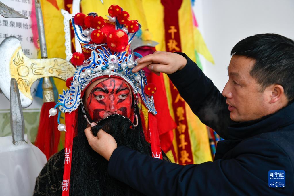 2月6日,龍里太平花燈戲藝人劉江(右)在給戲班年輕成員整理行頭。