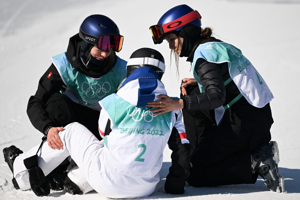 2月8日,谷愛(ài)凌(右)和瑞士選手瑪蒂爾德·格雷莫德(左)在比賽后安慰法國選手苔絲·勒德。新華社記者薛宇舸攝