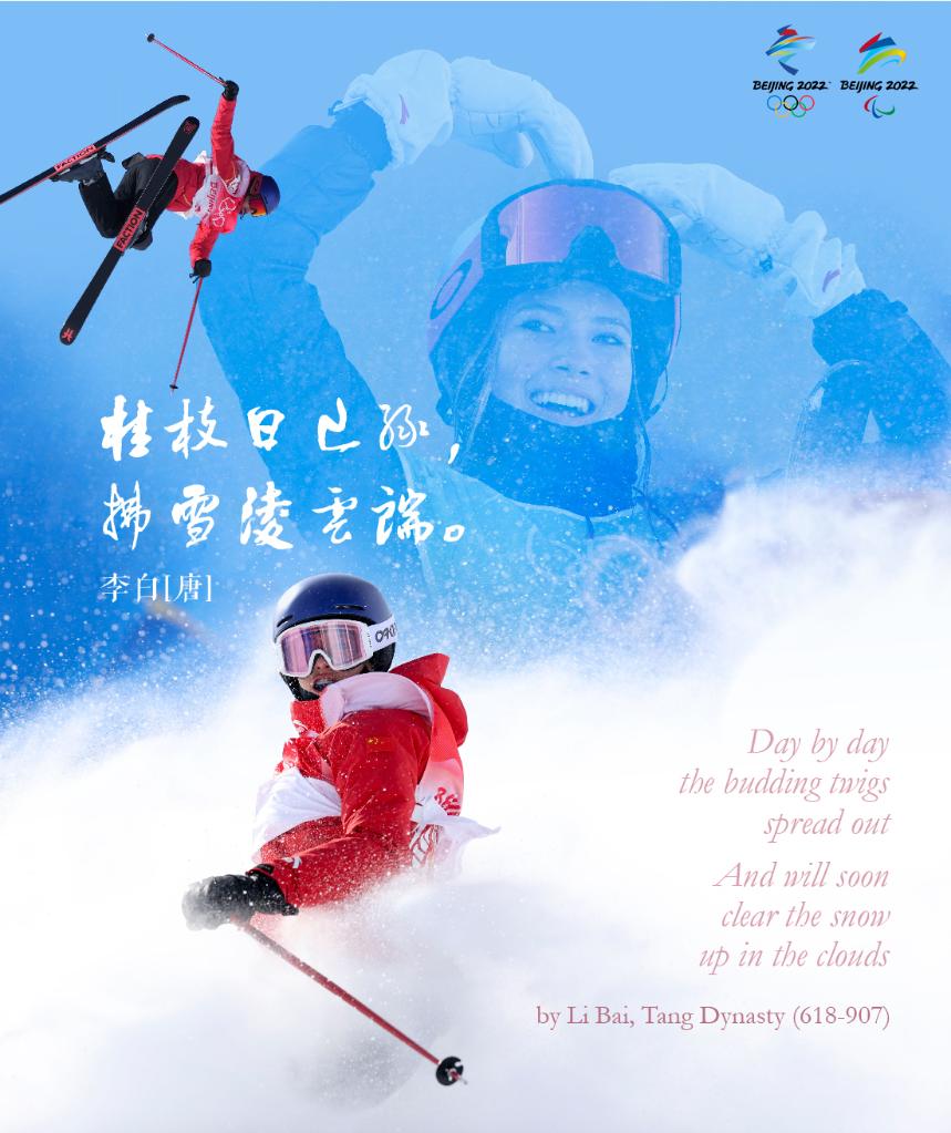 中國隊選手谷愛(ài)凌奪取自由式滑雪大跳臺項目的冬奧會(huì )歷史首金,也是中國女子雪上項目在冬奧會(huì )上獲得的首枚金牌。李白不禁要感嘆年輕選手的銳氣與活力:“桂枝日已綠,拂雪凌云端?!?/font>