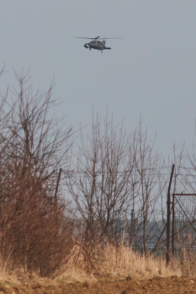 記者又驅車(chē)前往熱舒夫西北部60多公里處的梅萊茨機場(chǎng)。駛近機場(chǎng)就看到黑鷹直升機低空盤(pán)旋。在這座面積并不大的機場(chǎng)外,排隊停著(zhù)十多輛油罐車(chē),準備提供燃油供給。機場(chǎng)附近,兩名荷槍實(shí)彈的美軍士兵把守著(zhù)一座美軍軍營(yíng)。從外圍可以看到機場(chǎng)里??恐?zhù)數架黑鷹直升機和奇努克運輸直升機。