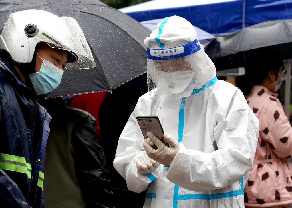 3月13日,志愿者在深圳羅湖區東門(mén)廣場(chǎng)核酸檢測點(diǎn)引導居民。新華社發(fā)(儲焱攝)