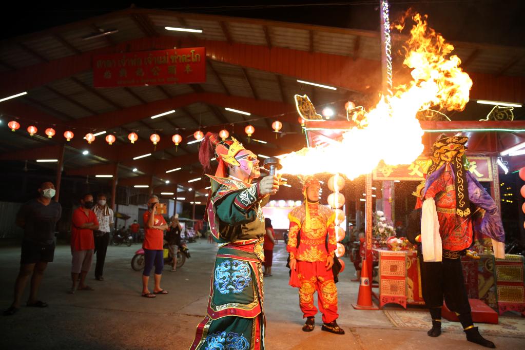 在泰國那空沙旺府,一名潮劇演員在表演噴火。新華社記者王騰攝