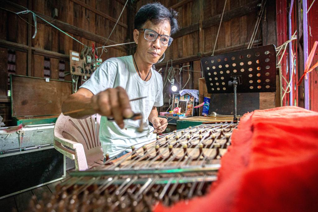 在泰國那空沙旺府,一名潮劇團樂(lè )師在演奏樂(lè )器。新華社記者王騰攝