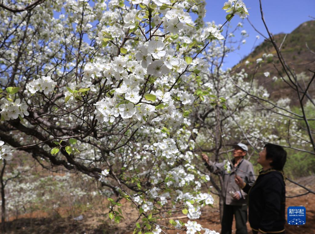 4月12日,河北省唐山市遷西縣新莊子鎮常甸村農民在給梨花授粉。