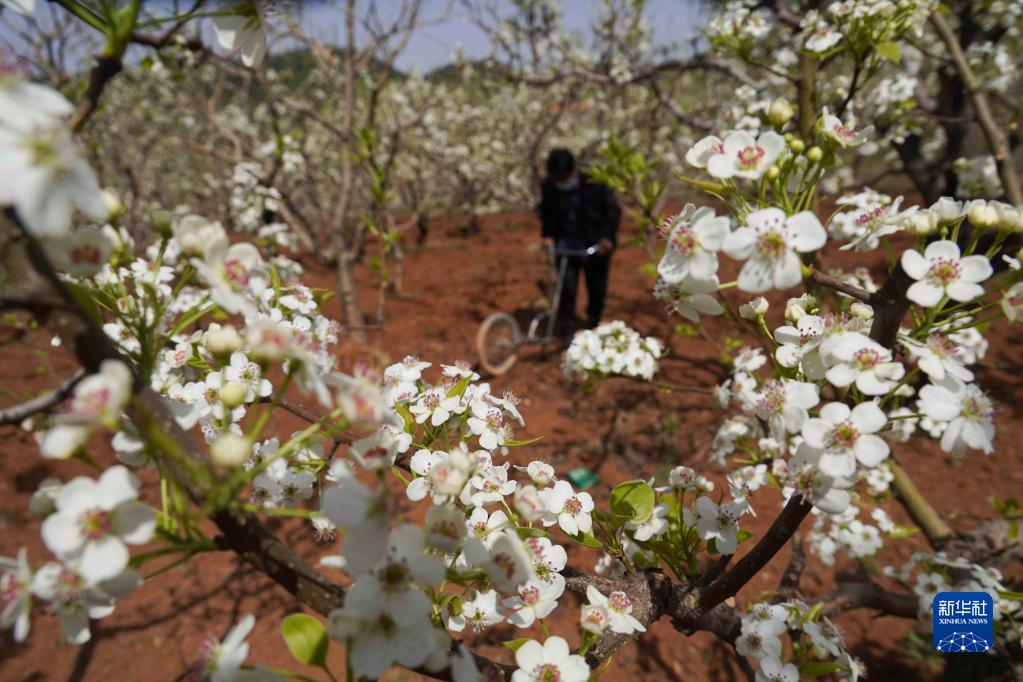 4月12日,農民在河北唐山遵化市娘娘莊鄉蘆各寨北山村的梨樹(shù)果園進(jìn)行松土。
