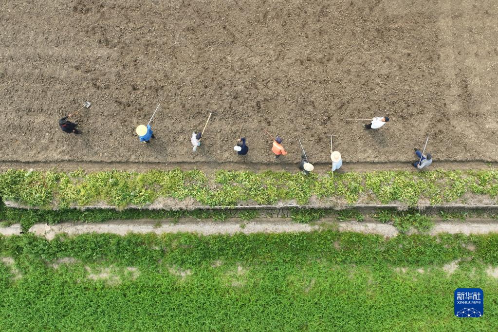 4月12日,在江蘇省淮安市洪澤區三河鎮,農民在整理育秧田(無(wú)人機照片)。