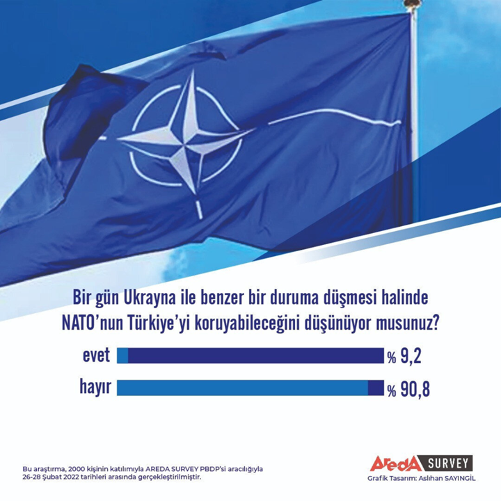 另一家民調機構Areda2月底公布的民調結果顯示,逾90%土耳其受訪(fǎng)者認為,倘若土耳其面對烏克蘭現在的狀況,不能指望北約出手保護。