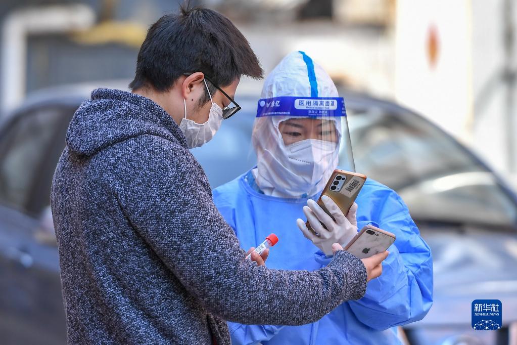 4月14日,在吉林市船營(yíng)區大東街道一核酸檢測采樣點(diǎn),工作人員為居民進(jìn)行核酸檢測采樣登記。新華社記者 張楠 攝