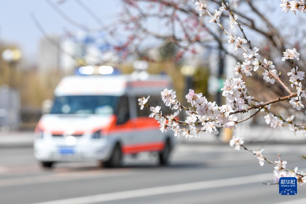 4月14日,一輛救護車(chē)在吉林市松江東路上駛過(guò),路邊桃花已經(jīng)盛開(kāi)。新華社記者 張楠 攝