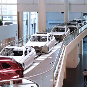 2月16日,在華晨寶馬沈陽(yáng)鐵西工廠(chǎng),生產(chǎn)中的車(chē)輛穿過(guò)辦公區。新華社記者楊青攝