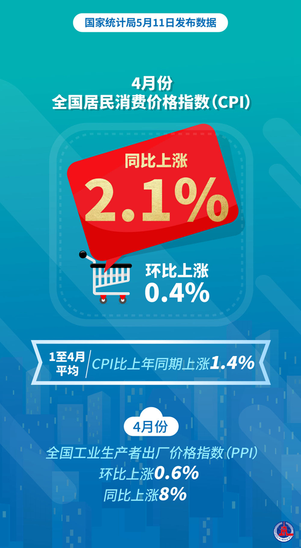 新華社北京5月11日電(記者申鋮、魏玉坤)國家統計局11日發(fā)布數據,4月份,全國居民消費價(jià)格指數(CPI)同比上漲2.1%,環(huán)比上漲0.4%。1至4月平均,CPI比上年同期上漲1.4%。