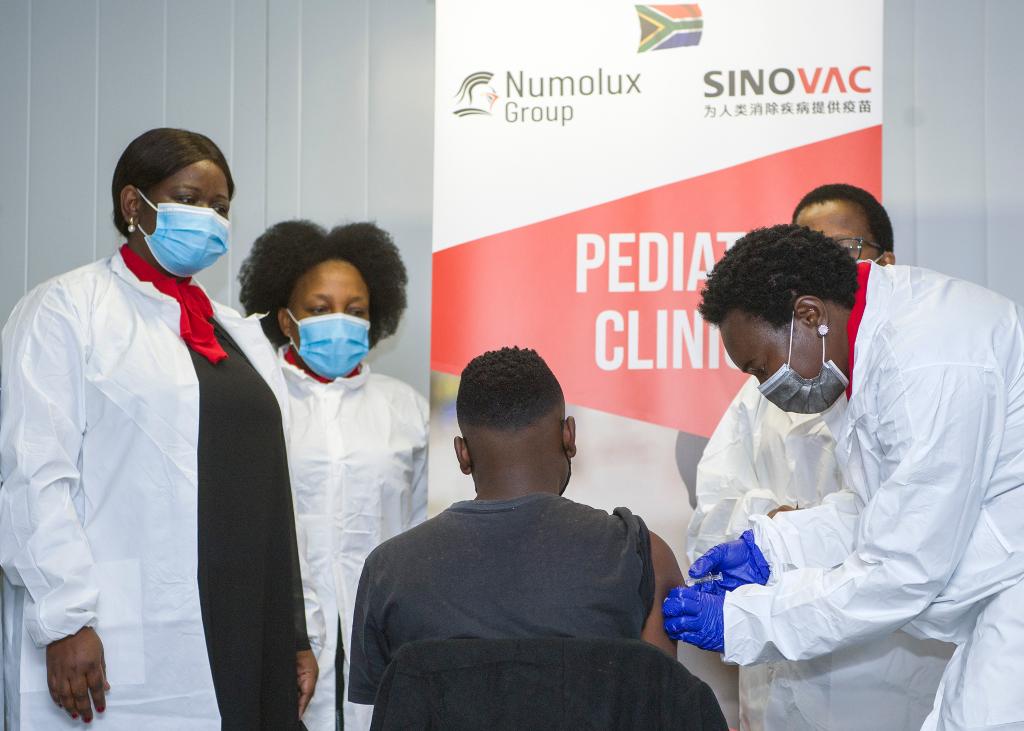 2021年9月10日,在南非比勒陀利亞,醫務(wù)人員給首名青少年志愿者注射第一劑科興疫苗。新華社記者 陳誠 攝