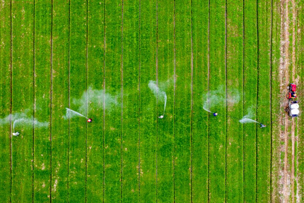 2月16日,安徽省廬江縣白湖鎮農民在進(jìn)行小麥病蟲(chóng)害防治作業(yè)。(無(wú)人機照片,新華社發(fā) 左學(xué)長(cháng) 攝)
