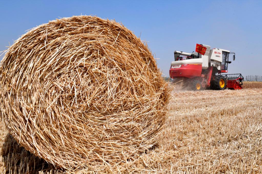 6月2日,在山東省郯城縣郯城街道,農民駕駛農機收獲小麥。(新華社記者 郭緒雷 攝)