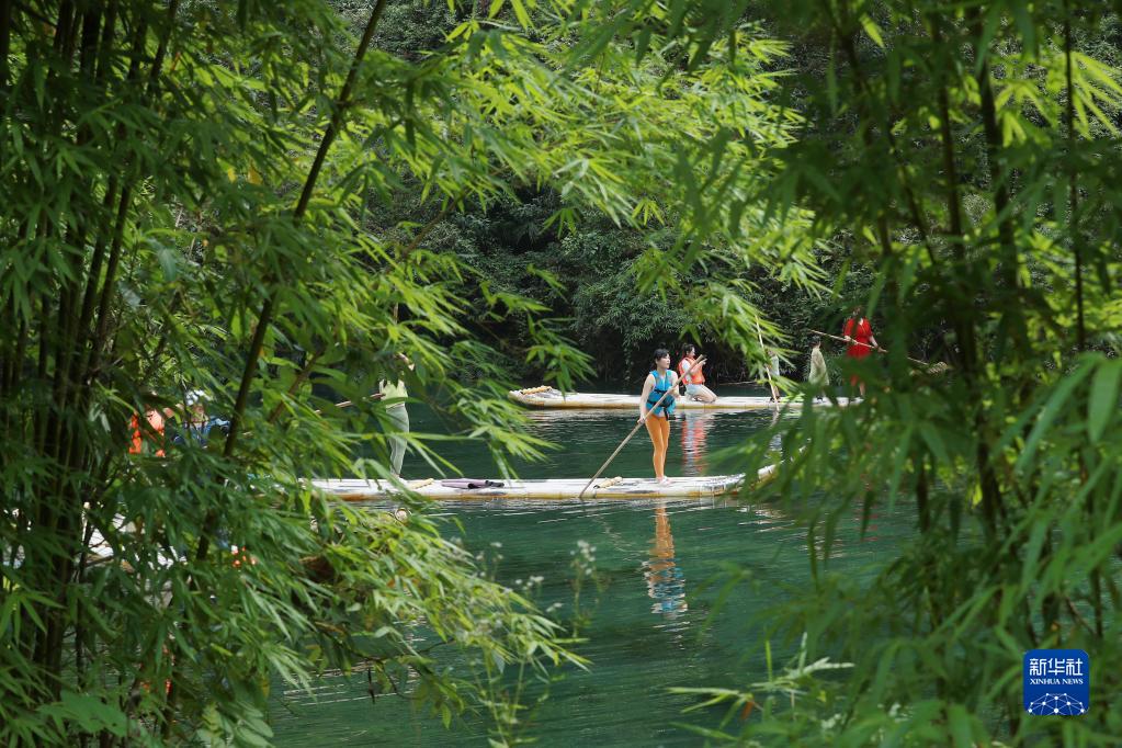 7月16日,游客在湖北省宜昌市秭歸縣三峽竹海生態(tài)景區體驗竹筏親水項目。