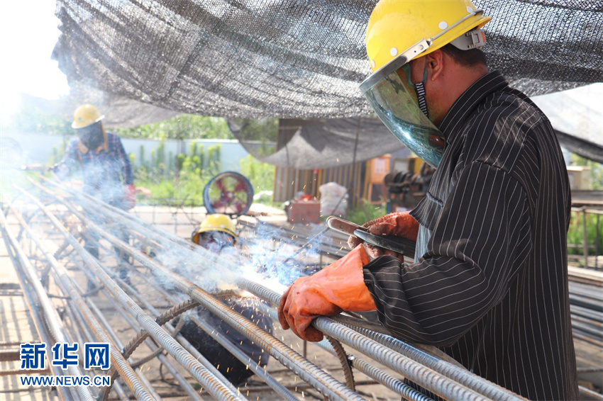 在義東高速1標白云互通施工現場(chǎng),30多名班組工人開(kāi)展支架搭設、鋼筋綁扎、焊接等工作?!白罱鼘?shí)在太熱了,我們就把(每天的)工作時(shí)間提前了?!变摻罟ず喂鹈酪贿吔変摻?,一邊說(shuō),綁扎鋼筋是在給后續混凝土澆筑工作做鋪墊,必須要快,但這樣的大熱天,確實(shí)戴著(zhù)手套都燙手,不過(guò)為了工作,大家都習慣了。因為暴露在太陽(yáng)下工作,何桂美臉頰已被炙烤得通紅。