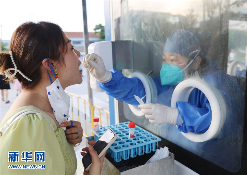 在臺州玉環(huán)市龍溪鎮花巖浦文化禮堂、龍溪公園等便民核酸采樣點(diǎn),醫務(wù)人員、黨員志愿者身穿防護服、冒著(zhù)高溫有序地進(jìn)行核酸采樣。