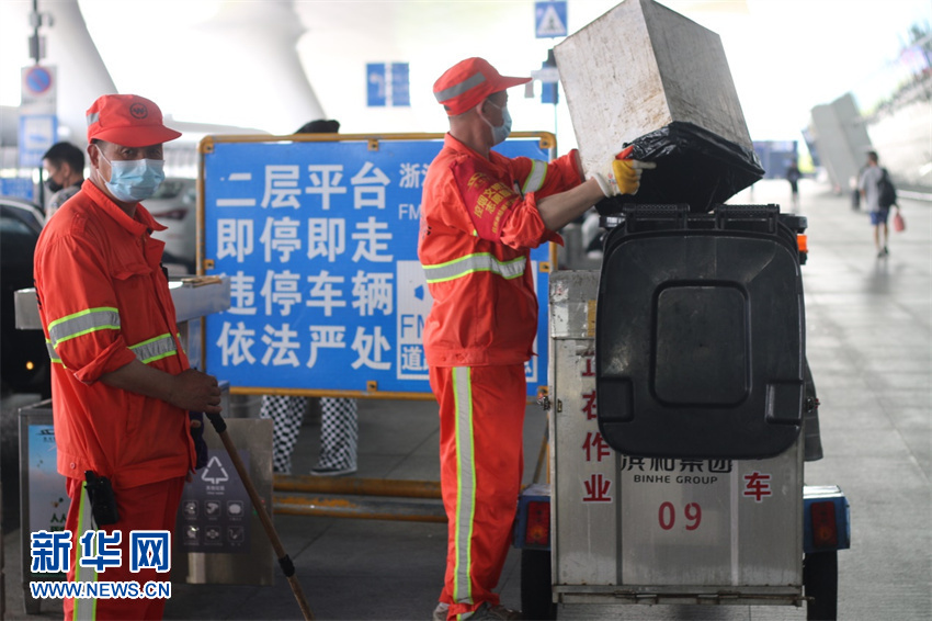在杭州東站,環(huán)衛工人清掃清運不停歇。