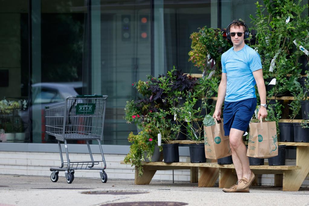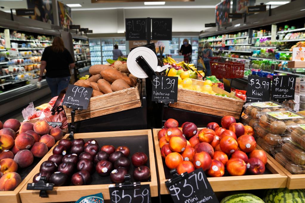 6月14日,在美國華盛頓,一名男子提著(zhù)購物袋從一家食品超市旁走過(guò)。(新華社發(fā),沈霆攝)