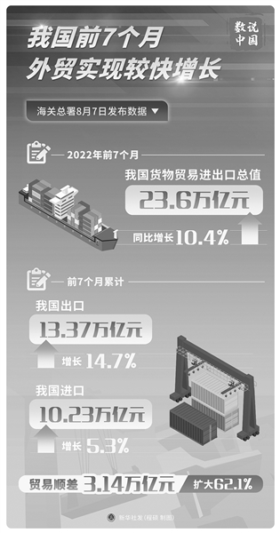 8月7日,海關(guān)總署發(fā)布數據顯示,今年前7個(gè)月,我國進(jìn)出口總值23.6萬(wàn)億元人民幣,比去年同期增長(cháng)10.4%。其中,7月份進(jìn)出口總值3.81萬(wàn)億元,同比增速進(jìn)一步提升為16.6%。