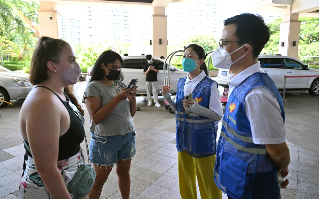 三亞外籍游客向志愿者咨詢(xún)相關(guān)防疫政策。 新華社記者 郭程 攝