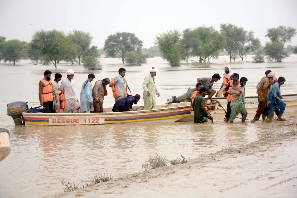 8月27日,在巴基斯坦拉金布爾,救援人員幫助受災民眾撤離。新華社發(fā)(曼蘇爾攝)