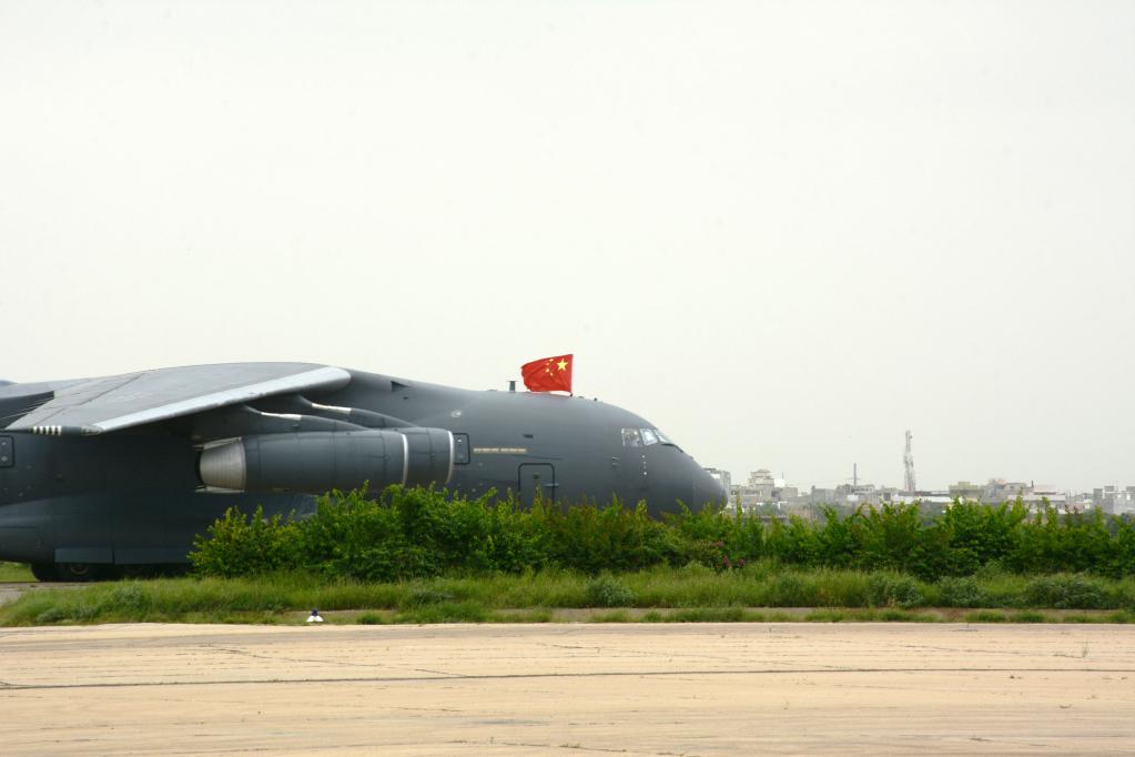 8月30日下午,這架載有中國援巴抗洪救災人道主義物資的中國空軍運-20運輸機抵達機場(chǎng)。連續兩天,共有4架次中國飛機將災區最急需的首批帳篷運送至巴基斯坦,用于安置災民。
