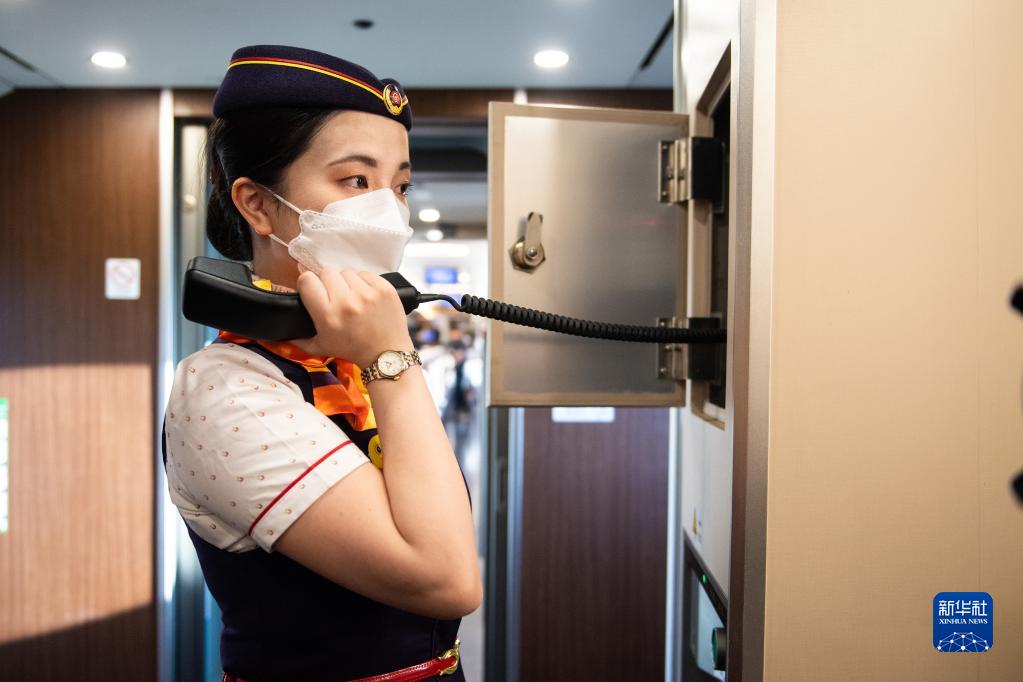 9月6日,在渝廈高鐵益長(cháng)段長(cháng)沙首發(fā)G6518次列車(chē)上,乘務(wù)人員向乘客們播報列車(chē)信息。新華社記者 陳思汗 攝