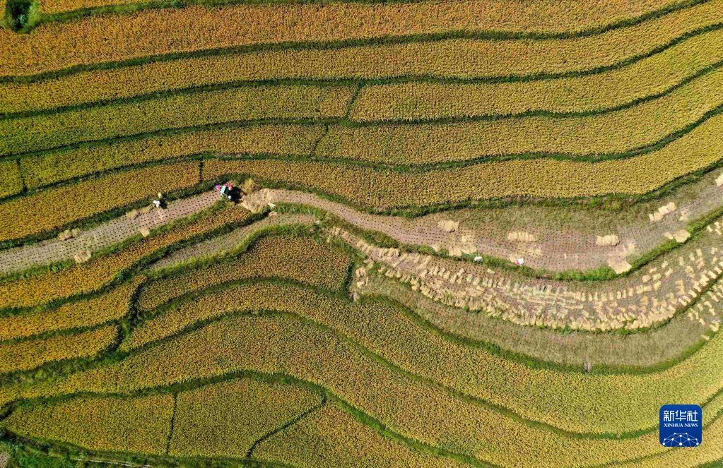 9月18日,村民在貴州省貴陽(yáng)市開(kāi)陽(yáng)縣溫泉村收割水稻(無(wú)人機照片)。