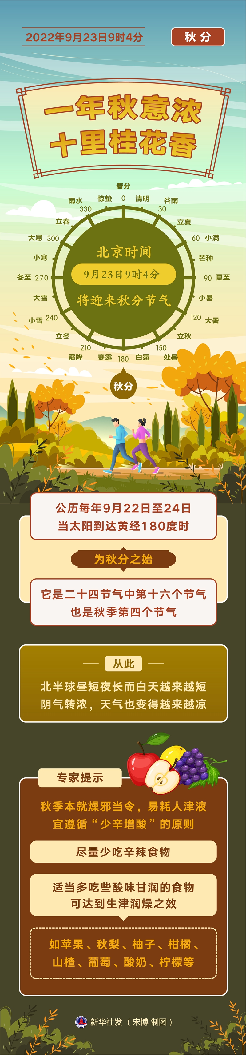 秋分時(shí)節,公眾應如何在飲食上加強自身調理呢?由國慶結合民間傳統和養生專(zhuān)家的建議提示,秋季本就燥邪當令,易耗人津液,宜遵循“少辛增酸”的原則,盡量少吃辛辣食物,適當多吃些酸味甘潤的食物,可達到生津潤燥之效,如蘋(píng)果、秋梨、柚子、柑橘、山楂、葡萄、酸奶、檸檬等。