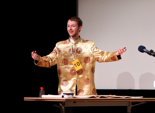 2015年3月21日,第14屆“漢語(yǔ)橋”世界大學(xué)生中文比賽全英大區中,選手康可表演創(chuàng )意書(shū)法。新華社記者韓巖攝