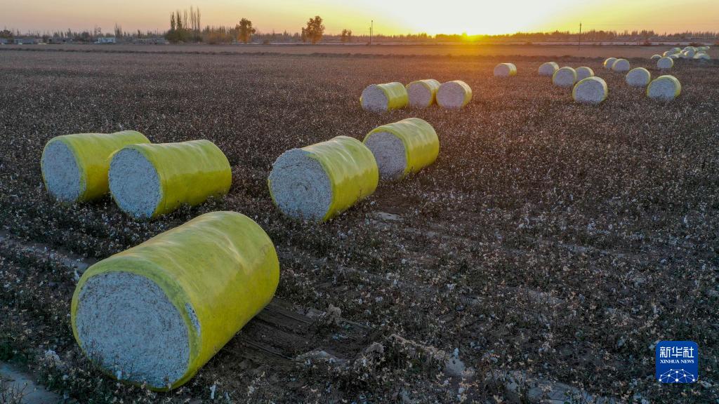 在新疆沙雅縣海樓鎮一處棉田里拍攝的打包完成的棉花(11月10日,無(wú)人機照片)。
