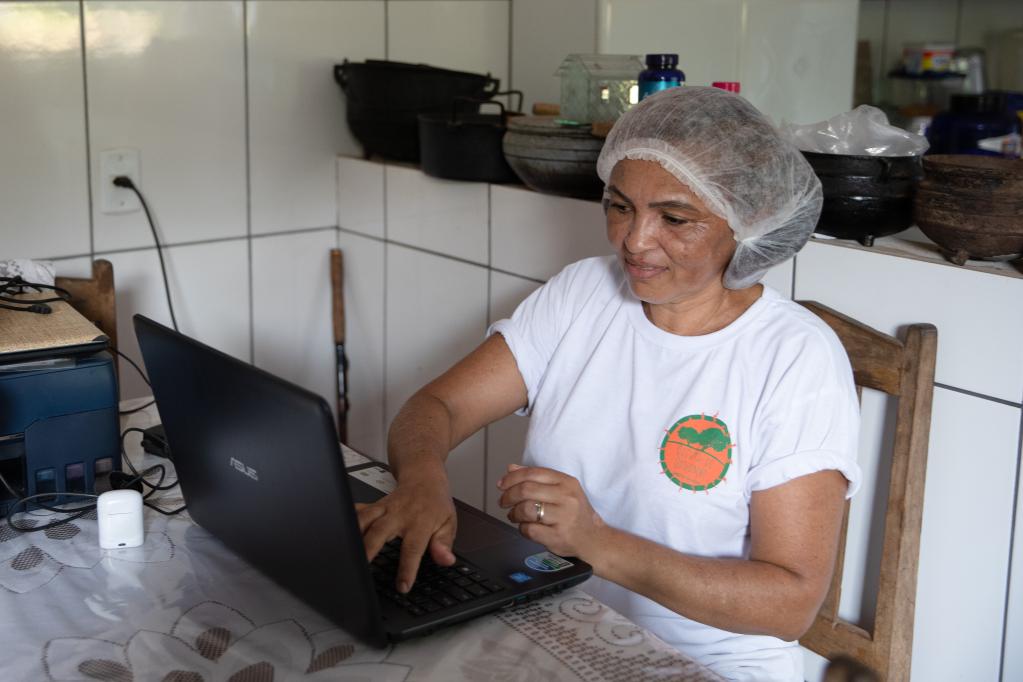 2022年10月4日,在巴西托坎廷斯州馬利亞迪尼亞,水果加工廠(chǎng)工人馬萊娜在家中使用新買(mǎi)的電腦。新華社記者 王天聰 攝