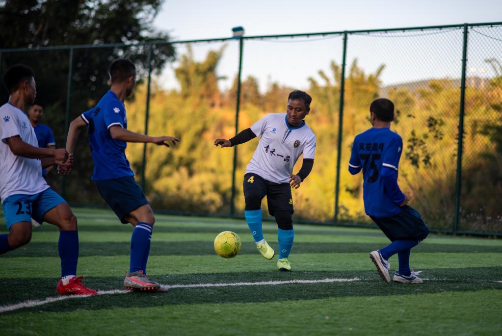 云南省滄源佤族自治縣龍乃村現任足球隊隊長(cháng)鮑艾改(右二)在一場(chǎng)比賽中。